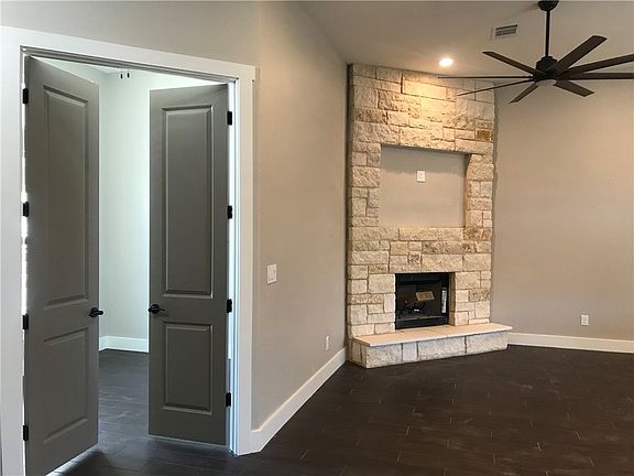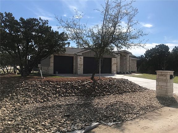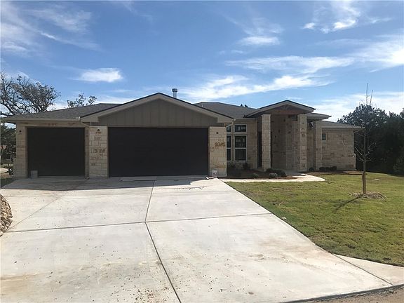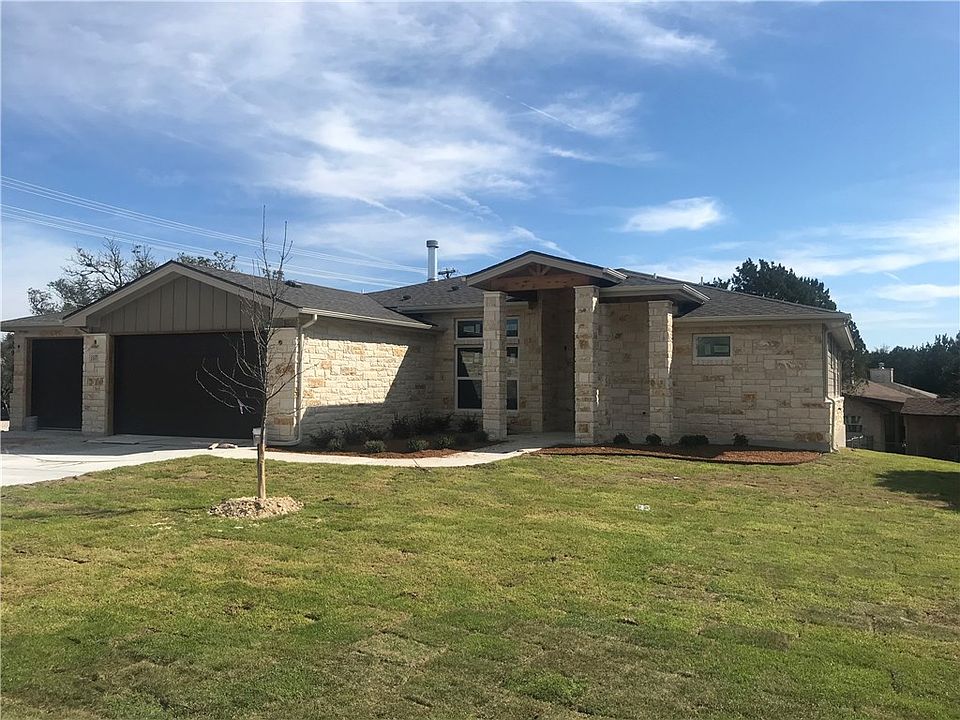 This single story home has 3 bedrooms as well as a dedicated study/den. The highly desired split floorplan has the master suite on one side of the living area and the guest bedrooms and bath on the other side. You'll be amazed by the huge dine-in island...the openness of the kitchen and living welcomes everyone to eat, hangout, watch tv, or just enjoy each others' company with a fire burning in the background. The master suite offers access to the covered back patio, a large walk-in closet, double vanity and walk-in shower. Finishes are light and bright Hill Country Transitional patterns that have a hint of contemporary style but with classic colors. Driveway and front of home on a cul-de-sac. Fantastic community amenities! Lake access, 7 waterfront parks, multiple boat launch areas, public golf course, disc golf, pickleball, tennis, community pool, community events, even a general aviation airport.