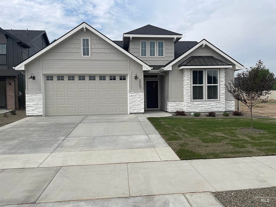 Beautiful new custom construction 3 bed, 2 bath plan w/ additional sitting room off master bedroom, extensive woodwork, alder custom cabinets, 5 burner gas cook top, and quartz countertops. Master suite features full tile shower & tub . 95% eff. furnace, two gas fireplaces, under mount sinks, covered patio, insulated painted 3 car tandem garage w/ 8' door. Full landscape & fence. 2x6 Const. Located in one of SW Boise's newest sub w/ a great centralized location. BTVA. Builder/Agent.