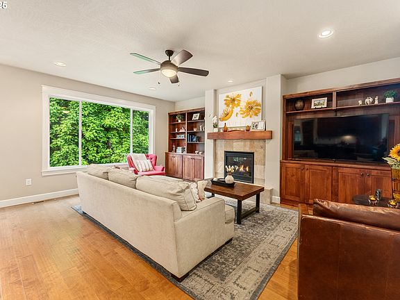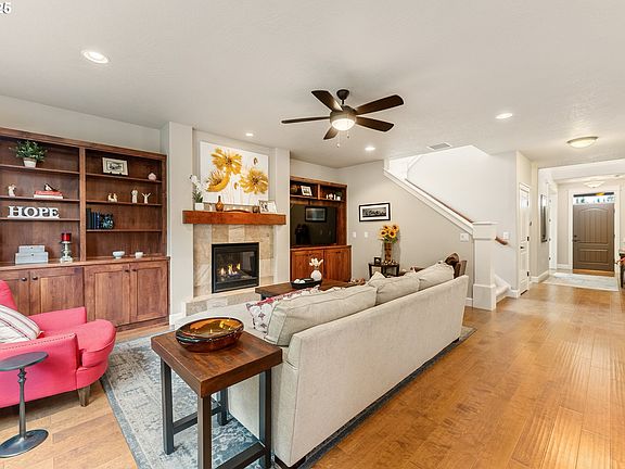 Spacious Craftsman with Scenic Views, Bonus Room & Backyard Retreat! Located in the quiet Summit Sky neighborhood of Southwest Eugene, this Craftsman home offers a functional layout, quality finishes, and a private natural setting. The main level features engineered hardwood floors, an open-concept kitchen with quartz countertops, stainless steel appliances, tile backsplash, and a central island. The adjacent dining and living areas include a gas fireplace and large windows that bring in natural light. A main-level bedroom provides flexibility for a home office or guest room. Upstairs, the primary suite includes a generous walk-in closet and an en suite bath with dual sinks and a tub/shower combo. Two additional bedrooms, a pocket office and a large bonus room—ideal for a media room, play space, or home gym—complete the second floor. Step outside to a spacious, fully fenced backyard that backs to a protected conservation area. The deck provides space for outdoor dining and entertaining, and the built-in fire pit creates a great spot to gather. There's also plenty of lawn for kids, pets, or garden space, all with a backdrop of mature trees and visiting wildlife. Blocks to Wild Iris Ridge Park with access to hiking trails and sweeping views. Two-car garage, covered front porch, and low-traffic street in a nature-rich setting with city convenience.