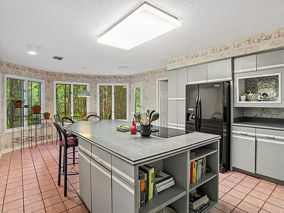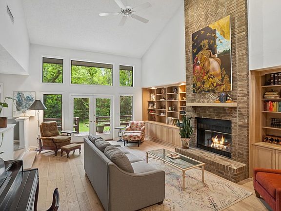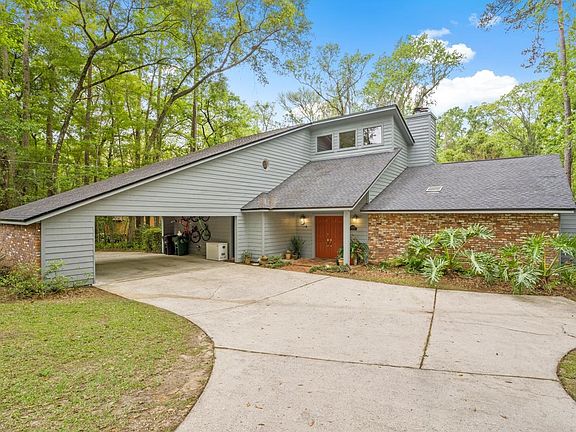 Ctg on inspections. Please continue to show for backup contracts! Soaring contemporary custom build by Willis Builders Inc. Grande entrance into sunken living room with dramatic brick fireplace, built-in bookcases with cabinet storage, and plenty of windows. Dining and living rooms share unobstructed views of woodland scenery with French doors to wrap around deck. Dining room and front hall lead into massive eat-in kitchen with long island bar and separate breakfast nook with its own deck access. Primary bedroom sits across the house with updated en suite bath, walk-in closet, wood-burning fireplace, and secluded screened porch for bird watching. Additional private guest suite down kitchen hallway to complete main level. Two large bedrooms upstairs share walk-through bathroom. Small door leads to above carport attic storage with plywood floor. Home is located outside the city limits yet convenient to everything. Opportunity to add a guest house, workshop, or she-shed on northern portion of 1.5+ acres. Trees have been cleared around back to allow home space to breathe. Large backyard fenced above and below ground for pets, organic garden area, children's play set, fruit trees, and berry bushes. Enormous circular driveway with two car pass-through carport with hall entrance for rainy days.
