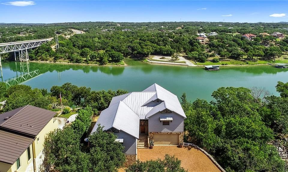 Waterfront Hill Country Contemporary home with 1.8 private acres on the Pedernales arm of Lake Travis. Fabulous views, open floor plan and a 4 car garage with 2 car drive thru that converts to large exterior game room. Two large master suites plus garage apartment with separate kitchen. Large covered decks with views of the Lake and Hill Country. Expansive great room with vaulted ceilings and fireplace. Modern Kitchen, sleek cabinetry thru out, stainless appliances. Privately gated waterfront retreat!