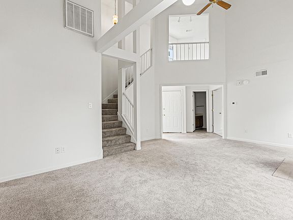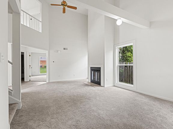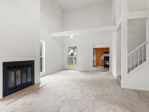 Tucked away at the end of a quiet cul-de-sac in The Vineyard, this home features new windows, fresh carpet, and interior paint. The main level offers a spacious living room with vaulted ceilings and a cozy fireplace, while the kitchen includes warm wood cabinetry and space to cook or gather. The first-floor primary bedroom includes a full bath for added convenience. Upstairs, you'll find a large second bedroom paired with its own full bathroom. A two-car garage adds both parking and extra storage.