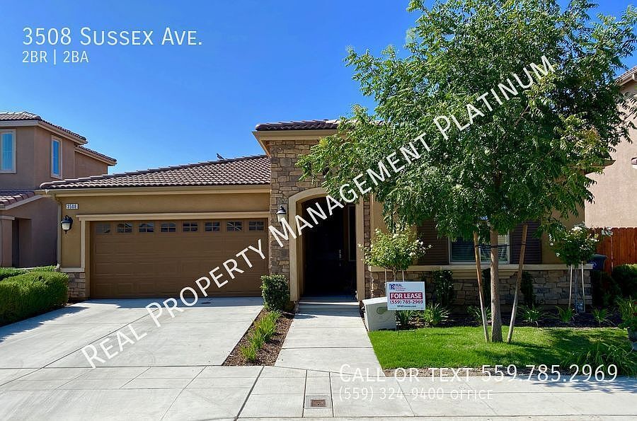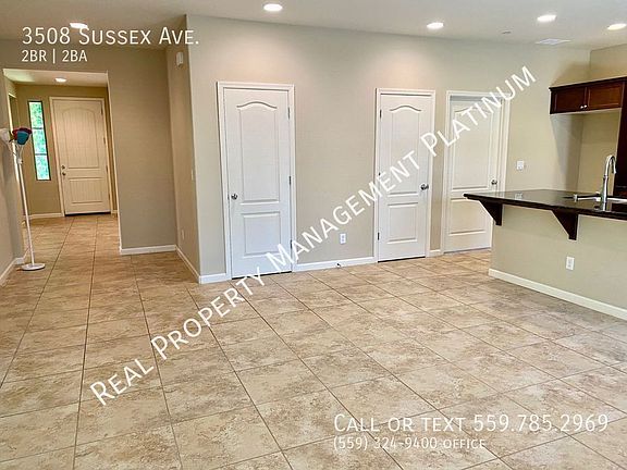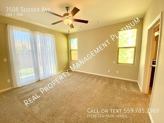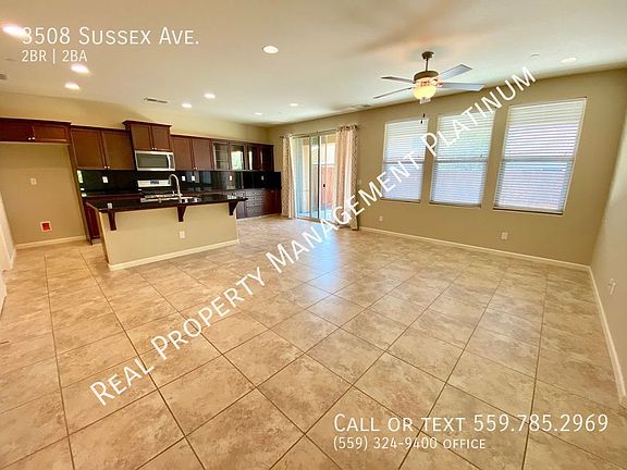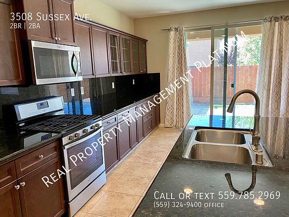 2 bed + flex space, 2 bath, 1504 sq. ft. Flex space/office near front entrance. Kitchen has breakfast bar and lots of cabinet space. Stainless appliances include built in microwave, gas stovetop / range, & dishwasher. Dining area has access to backyard. Large great room. Main bedroom has sliding glass door that leads to backyard. Main bathroom has walk-in shower, dual vanity, and walk-in closet. One additional bedroom with ceiling fan. One additional bathroom with single vanity and tub/shower. Interior laundry with gas/electric hook ups. Attached 2 car garage. Beautiful backyard. Credit score above 650 REQUIRED. Yard care is provided. Clovis schools. Non smoking. No pets. Renter's insurance is required. DRE# 01901101. All information is deemed reliable but not guaranteed and is subject to change. Non Smoking Renters Insurance Required
