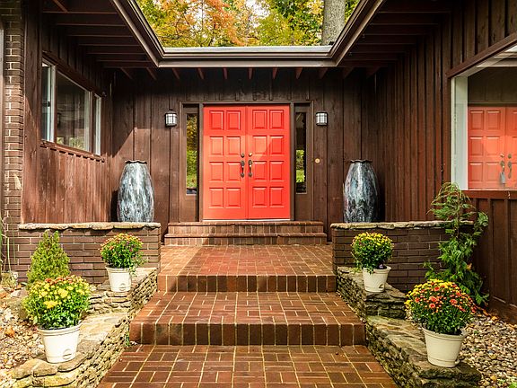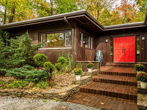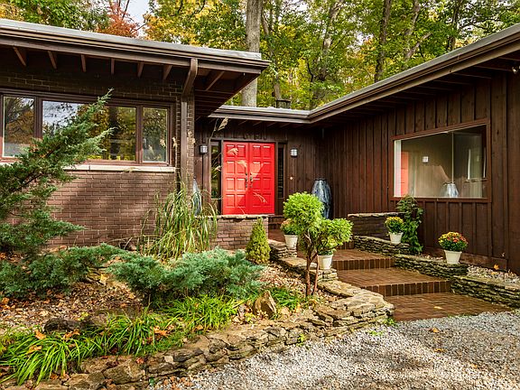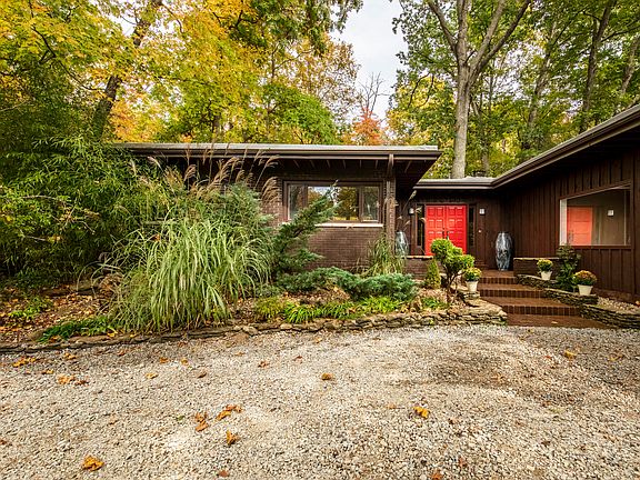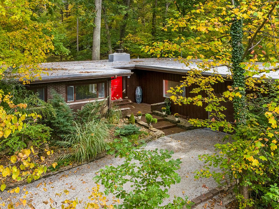 Mid-century modern home in an incredible wooded setting in quiet Borowick Farms! You pull in the drive to see a stone entry wall with a drive that goes over a small creek. The home is truly nestled among the trees! Inside you have an open concept with a wall of glass when you open the front door that admires the rear yard and patio. The stone fireplace only enhances the ambiance! There is 2 living areas, a study, three great bedrooms and 2 full baths. Updated flooring (wooden and laminate flooring throughout). There is a basement for storage or an extra bonus space. The rear yard is a perfect mix of a patch of open grass and gorgeous massive hardwood trees. This truly is a treat to see! The seller has done endless updates and improvements, see attached updates list for more details!