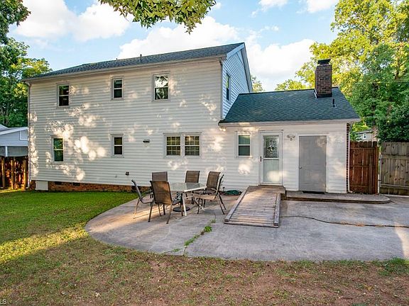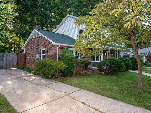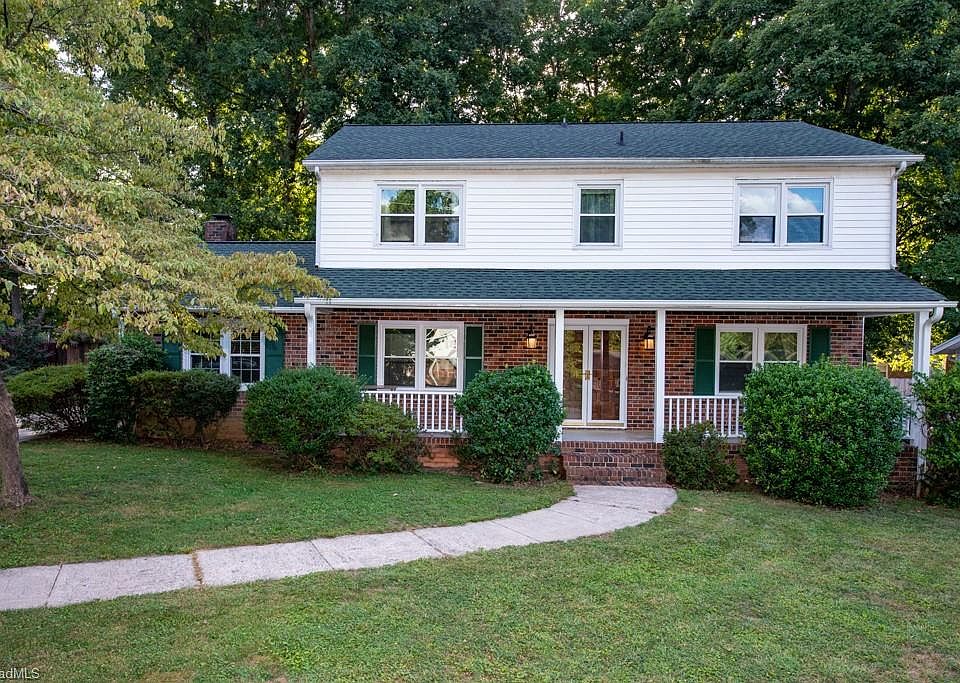Brick and vinyl 2-story Traditional home with 34' rocking chair front porch. Vinyl replacement insulated windows throughout. Two Heat Pumps installed in 2009 per owner. Roof installed installed 2017. Hardwood floors through much of main level & 2nd floor also. Kitchen has light raised panel cathedral wood cabinets. Updated Frigidaire smooth top stove & refrigerator. Kitchen aide dishwasher. Kenmore microwave. Waste King disposal. Foyer has hardwood floors, wood steps and stairs elevator that makes house qualify for ADA. Living room has HW floors and crown molding. Office on 1st fl behind LR. Den has built-in shelves & desk, a large corner brick fireplace with wood mantle and brick raised hearth. Large fenced rear yard with a 2 story storage building. Great home in a quiet subdivision. Close access to Oak Hollow Lake marina and Oak Hollow golf course. Two storage buildings in back yard, his & hers. Ext. storage Rm. Central location North High Point has good access to 74 to GSO or W-S.