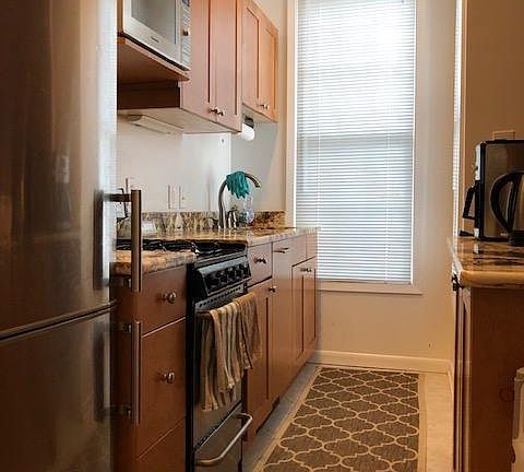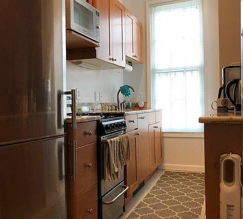 Sunny one bedroom apartment with back garden for outdoor entertaining on those warm sunny spring and fall days. The apartment is updated throughout in excellent condition. Gourmet galley kitchen has gas stove, stainless steel equipment, granite countertops, brick wall and miele refrigerator and dishwasher. (Miele equipment is German-made.) Spacious living room/dining room boasts working wood burning fireplace and large picture windows/doors. Master bedroom has big bay windows and large closet. Bathroom is tiled with shower and front loading miele washer dryer. There is also a large extra storage closet! There are beautiful wood floors and high ceilings throughout. Internet is included. NO SMOKING. NO PETS