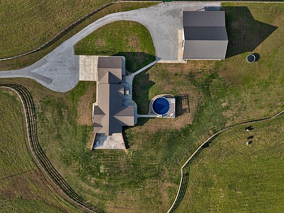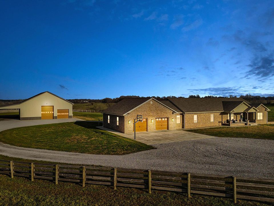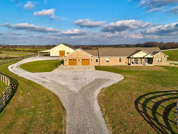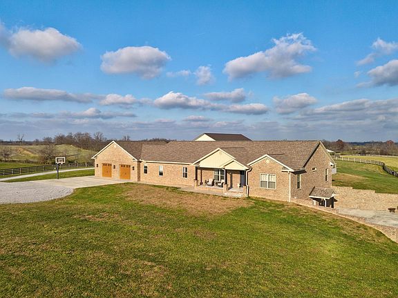 Set on 27± fully fenced acres of pristine Kentucky countryside, this custom-built luxury home exudes sophistication from the moment you arrive. Every inch has been thoughtfully designed with premium materials, refined finishes, and an effortless sense of elegance, offering privacy, space, and an unmatched lifestyle. Inside, the split floor plan opens into an expansive main living area highlighted by Brazilian tigerwood flooring, soaring ceilings, and beautifully curated design. The large, open, and airy kitchen and dining space sits at the heart of the home, featuring granite countertops, a massive bar island, custom tile accents, and a walk-in pantry with a built-in coffee bar. This stunning space flows seamlessly into the living and dining areas, perfect for hosting or everyday luxury living. A dedicated office, large mudroom, and walk-through laundry room elevate the home's style and functionality. The primary suite is a true sanctuary, complete with its own sunroom, an indulgent spa-inspired bathroom with double vanities, an elegant soaking tub, and a custom-tiled walk-in shower with dual showerheads. An enormous walk-in closet with custom shelving completes this serene retreat. Two additional bedrooms and a full bath round out the main level. The basement lives like a second home, ideal for multigenerational living, private guest quarters, or luxurious entertainment spaces. It includes a full kitchen, wet bar featuring an ice maker with granite, dining area, living room, walk-in pantry, full bath with tub/shower, two additional bedrooms, and two spacious storage closets, plus a hidden safe room for added peace of mind! Beyond the home, the estate continues to impress with a 3,250 sq. ft. detached garage featuring concrete floors, perfect for vehicles, equipment, or a premium workshop. A farm shed adds additional functionality, while the geothermal system provides year-round comfort and efficiency. Elegant, expansive, and set on a rare 27± acre fully fenced estate, 351 Benton Road offers a level of luxury that is truly extraordinary, an unparalleled opportunity for those seeking privacy, refinement, and country living at its finest!