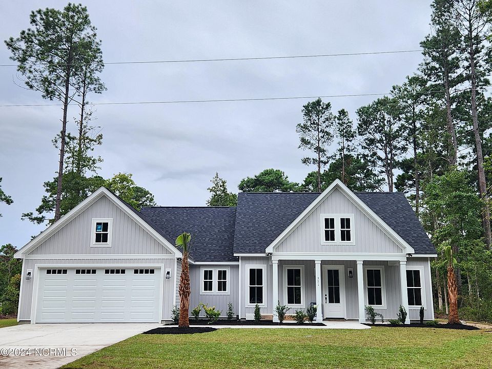 Modern farm house style new construction custom designed home with 3 bedrooms and 2 baths located in Carolina Shores North. When entering the home, you are welcomed by the large foyer which features custom wainscotting and crown molding. Adjacent to the foyer is the dining area which also includes crown molding and wainscotting. The kitchen offers quartz countertops, farm sink, oversized island, and stainless appliances, including, dishwasher, microwave, and range. The all-wood cabinetry comes with easy close doors and drawers. There is a huge pantry off of the kitchen that could also be used for an office/hobby room. The dining area is beautifully finished with wainscotting and crown molding. The living area has custom trim, ample room for entertaining and opens to a huge covered back porch. The master bedroom offers a trey ceiling with crown molding and a large walk-in closet. The master bath comes with dual vanities, quartz countertops, and custom tile shower. Master closet has builtin wood shelving.There is a large laundry room with built in cabinets and quartz countertops. This home has 9' walls with 6' windows, not the standard 8' walls with 5' windows. The home features an oversized 8'x18' garage door, along with gutters. The hot water heater is located in a closet inside the garage with extra room for storage.