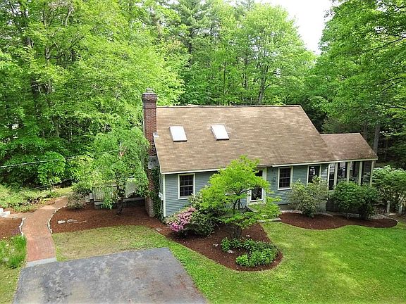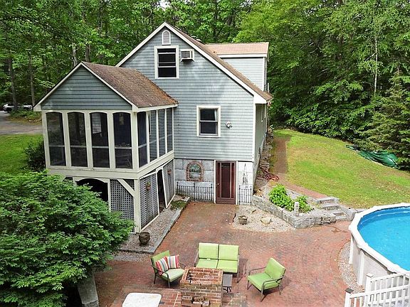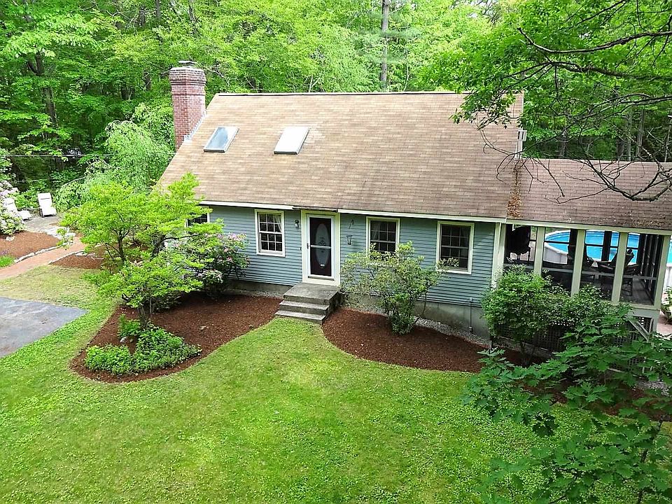 Charming 2+ Bedroom Contemporary Cape on a very private lot with beautiful gardens and Patios. This home was redesigned with a craftsman's woodworking and dental moldings. Enjoy relaxing in your sundrenched family room with skylights and gorgeous fireplace/woodstove. (currently used as large dining room). Plenty of cabinets and thoughtfully designed kitchen. Beautiful wide pine floors create warmth in the family room which leads to the rustic sunroom/3 seasons room. Entertain family and friends in the basement with Bar complete with beer tap. The basement flows right out to a wonderful patio with brick fireplace and grill area. An above ground pool will keep you cool this summer! There is a Pond at the edge of the property which will delight you. Come see all this amazing home has to offer! Delayed showings until 6/5/21. Open house Sat. 11 to 2 and Sun. 12 to 2.