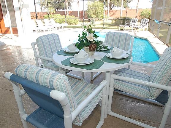 Presenting this 5 bedroom 3.5 bath pool home with a new roof as of July 2020. This furnished 2 story model features an open floor plan with 2 living rooms, eat in kitchen and formal dining room. There is a master suite downstairs with the remaining 4 bedrooms upstairs. The home has been a short term rental and any reservations in place would convey if current management retained. Centrally located for easy access to all highways and theme parks.