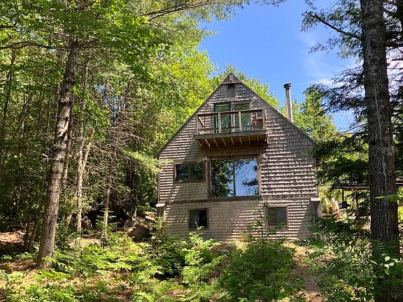 Rare opportunity to purchase a home with an acre of land located on a private cove on beautiful Hopkins Pond, one of the most pristine bodies of water in Maine. Hopkins Pond features brook trout & salmon stocked annually and caught right off the 32' wide permanent dock over water deep enough to dive into. The rarity is that this property is located at the dead end section of a road and it is bordered on three sides by land held in conservation easement by one of the largest private land owners in Maine; abutting land can never be built upon, including the opposite shore. Privacy & view are secured. The original 1979 house features traditional knotty pine interiors with an open concept; a 24'x14' carpeted living room with skylights and glass facing the water; a hearth with woodstove, a functional kitchen with 10' long cherry butcher block counter, and a large shelved pantry. A full bathroom and small bedroom with bunk beds are also on this level. The upstairs features the master bedroom with slider out onto a deck facing the lake, a half bathroom, and a laundry/utility room containing a stacked washer/dryer, water heater and plumbing. The house is heated with a propane furnace and woodstoves, and cooled by two built in air conditioners. The 28'x16' addition constructed in 2004 features a 16' high cathedral ceiling, hearth with woodstove, large staggered windows, a balcony, and a bedroom. The property also features a 16'x24' two story barn, two woodsheds and a triplex henhouse/storage building, as well as fenced in gardens. A rare opportunity indeed.