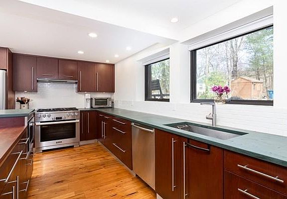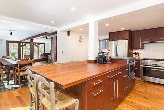 Mid Century Modern home features an entertainer's dream kitchen. Enjoy the heart of the home in the renovated Chef's kitchen: Cherry cabinets, large island with honed Slate counter tops, Miele 6 burner stove, wall oven. Kitchen opens to dining and living area. Imagine the entertaining you can do in the open space featuring lots of natural light flowing through the floor to ceiling windows. Upper level features 3 bedrooms, Master bedroom with vaulted ceiling, fireplace, and Juliet balcony. Lower level features another open, bright space for play room or living area with energy efficient pellet stove. Step out into screened porch and overlook the expansive wooded yard, or sit on the upper deck for an even better view. Many recent updates (within 5 years) including Roof, wall mounted Mitsubishi ac units, gas furnace, well pump, insulation and pellet stove. Reclaimed Oak floors through out the home. Home designed by well known architect Carl Koch.