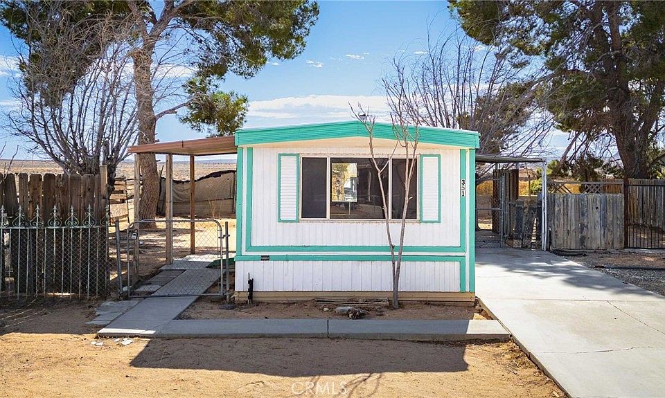 This charming mobile home measures 20'x60' and features 2 bedrooms and 1.5 bathrooms. It includes a covered patio, driveway parking, a spacious gated backyard, and a small shed. The property boasts several large trees, and the backyard offers plenty of space for RV storage, a garden, or a lawn. Enjoy beautiful desert views and easy access for hiking and off-roading. The seller is willing to give buyer's credit toward closing and is highly motivated.