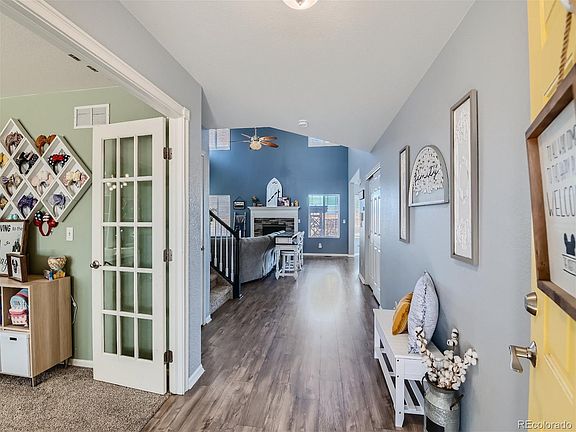 Welcome to this stunning 3 bedroom 3 bathroom home in The Village. You are welcomed by an inviting front porch and sunshine yellow front door. As you enter the home you are greeted by a spacious open floor plan and immense vaulted ceilings with natural light cascading throughout. French doors lead to generous office space featuring lovely bay windows. The expansive living room boasts an updated gas fireplace, beautifully adorned with decorative stone and custom built mantle. The dining room and kitchen flow seamlessly together for all your future entertaining. A modern updated kitchen with refinished cabinets including new hardware and added soft close, Corian counters, and all appliances stay. Ample pantry storage for those Costco shopping trips. Main floor laundry with included newer washer and dryer. A guest powder room completes the main floor. As you journey up the refinished black and white stair banisters you will find two bedrooms with a shared bathroom. The primary suite includes vaulted ceilings and walk-in closet. The primary bathroom features a garden soaking tub and dual sinks. The immense unfinished basement is ready for you to make it your own! You do not want to miss the gardener's dream backyard on this one! Sitting on one of the larger lots of the community, this home includes a shed, greenhouse and numerous garden beds. Summer BBQ's will be in your future with a generous concrete patio, and relaxing pergola. New carpet (2024) Newer laminate flooring (2021) Newer interior paint (2021) Newer Exterior Paint (2020) Newer Water Heater, A/C, Furnace (2021) Make this home your own Happily Ever After!