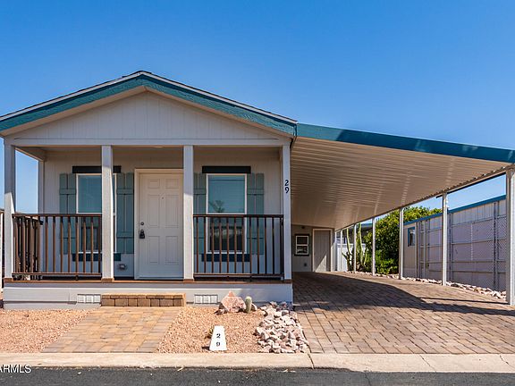 This 2023 Clayton build is your NextHome! Brand new ground level set up with a hassle free aluminum carport awning for parking. Thome has a beautiful front patio with desert landscaping. The drive way adds a nice touch with pavers instead of concrete. There is a 30-year shingle roof, painted hardboard siding with a new ac unit, and new washer and dryer. This new home is a single wide with two bedrooms and two baths to make it feel larger. There is waterproof linoleum flooring throughout the home, stainless steel kitchen sink, with Ozark kitchen cabinets, and a kitchen island. The home has also been recently installed with a water softener system and a reverse osmosis system. The exterior shed has been wired to receive power inside. The bathroom has added cabinet space above the toilet for extra storage. Huge master bedroom with full sized closet, with private full bathroom, standing shower with benches. The second bedroom can accommodate a standard size queen bed with a full-size sliding closet. Large second bathroom with tub shower. Located at Meridian Mobile Home Park a 55+ active gated community in the scenic Apache Junction. The community has lots of activities, Bingo, parties, fitness center, billiards, heated resorts style pool and spa.