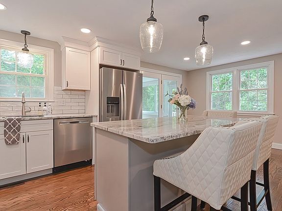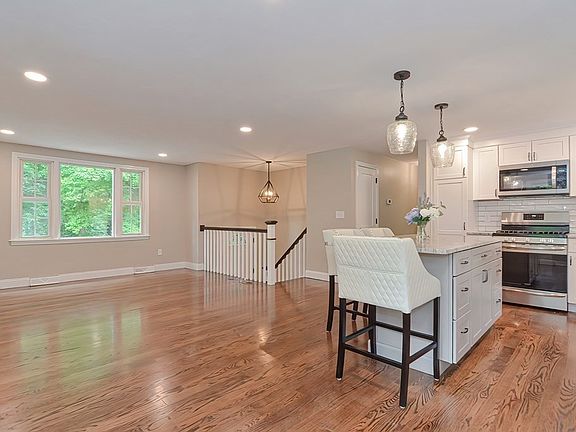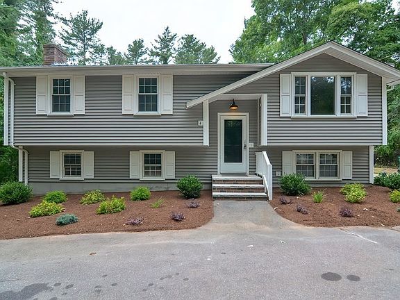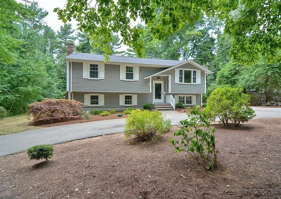 Beautifully renovated MANSFIELD home on private wooded lot! OPEN floor plan features NEW custom white shaker kitchen w/center island, quartz counters, tile back splash, stainless appliances including GAS stove, pendant & recessed lighting open to hardwood living room &dining flows to atrium door to three season room for morning coffee. Three good-size bedrooms, NEWLY renovated main bath on main level. Open Stairway to Lower level includes Family Room w/fireplace for expanded entertaining space & everyday living! Awesome Primary BDRM,w/NEW full bath:shower, flooring, beautiful fixtures. Laundry room & folding area. *Other features include:* hardwood floors throughout, freshly painted inside throughout, NEW roof 2022, hot water heater 2022, NEW Electric panel 2022, AC Condenser 2022, All Appliances 2022 &more! New foundation landscaping & seal coated circle driveway for convenient to RT 95/495/123 schools, shopping & commuter rail! Everything you need for an elegant & comfortable HOME!!