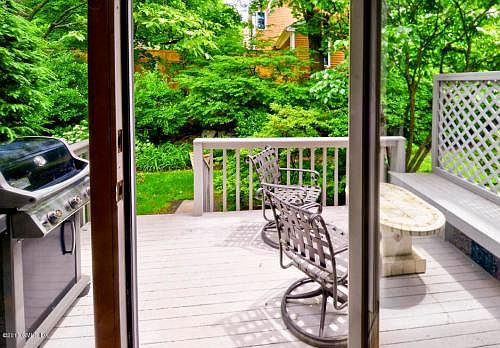 Updated spacious 2 BD, 2.1 BA townhouse with new bathrooms and hardwood floors upstairs and HVAC system. Bonus den/office/workout room. Everything you need: Private entrance with attached garage, large and bright eat-in kitchen with SS appliances and LR/DR with FP and French doors out to a deck and grassy area. Great location near shops, restaurants and close to Merritt Parkway and I-95.
