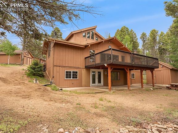 One-of-a-kind Colorado mountain sanctuary home with room to roam, relax and recharge! Multiple outbuildings make this property a hobbyist’s dream. The Main Home includes 4 bedrooms, 3 baths and 2 kitchens, ideally situated for a multi-generational household. Character abounds with the beautiful tongue-n-groove wood ceilings, moss rock fireplace and spiral staircase. Surrounded by nature, the scent of the pines will draw you in while the home itself is light and bright with tall windows, skylights and vaulted ceilings. The main level Kitchen features upgraded hickory cabinetry, newer farmhouse-style sink and upgraded glass tile backsplash. The dining area leads out to an expansive wood deck, perfect for entertaining or enjoying the privacy of this secluded location. Additional features include: woodburning fireplace for cozying up on a cold night, walkout basement with large patio area, upper level Master Suite with private balcony and hidden loft, 5-piece master bath with upgraded shower and double vanity, 2nd kitchen in basement for guest suite or in-law quarters, RV parking pad and dedicated firepit area. In addition to the main home, the “Man (or Woman) Cave” gives you an extra 1,642 sq.ft. of heated living space, featuring two 39x14 sq.ft. main level Rec Rooms, one with golf simulator and one with dry bar and light fixture for future pool table, plus upper level office (15x14) with built-in shelves, perfect for collection display or library, and bonus room/non-conforming bedroom (19x14). For energy-efficiency, the home and large outbuilding are both heated with Rinnai heat (propane), and master suite water is heated with solar. Other outbuildings include 2-car garage (22x22), 2-stall barn (20x16) w/concrete floor and loft, storage shed (12x10) w/workbench, & art studio shed (15x9). All this on 3.41 acres, horses allowed, on a county-maintained road. Just 4 miles from Divide with stores and other amenities. Bring your personal touches to make this home yours!