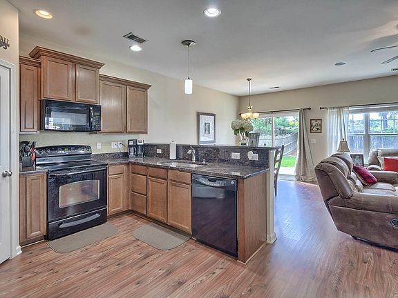 - RoomKitchenFeatures: Granite Counters, Pantry, Recessed Lighting, Cabinets-Stained, Floors-Laminate, Bar