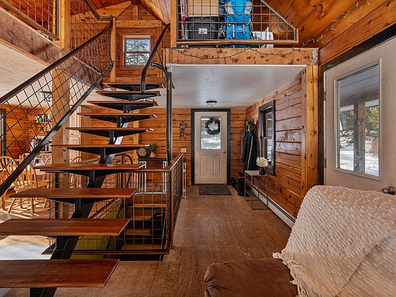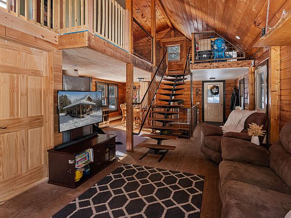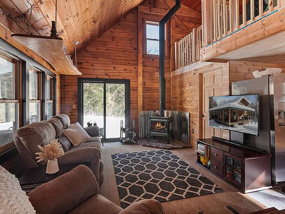 Motivated sellers in the heart of Jeffersonville! Experience true Vermont nature while staying close to the action. You’ll fall in love with this unique log home on 40+ private acres, all within minutes of the village. Stepping inside, you’ll find an open foyer space. To the right is a large dining area and an L-shaped kitchen with beautiful new wood cabinetry and modern stainless steel appliances. Also on this floor is a living room with glass doors leading outside, a wood stove, and a full bathroom. The vaulted ceilings above the living room make this space feel enormous! Up the central stairs is a large open loft. The space at the top of the stairs is perfect for a bedroom and has a walk-in closet. At the other end of the loft is an additional living space perfect for an office, playroom, reading nook, or more! The loft space features lots of windows for natural light and has railing for safety. The lower level features two bedrooms with full-sized windows, plus a half bath. Light and bright, this level offers direct access outside and more beautiful wood details. Outside, you have 41.9 lush acres to enjoy - wooded for privacy - plus a shed and a wraparound porch. Perfect for seasonal enjoyment or year-round Vermont living, this special property can't be beat!