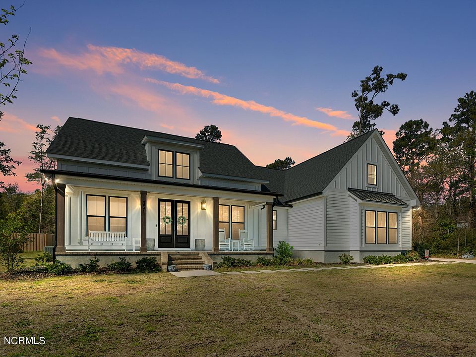 This luxury custom modern farmhouse is situated on an elevated .46 acre wooded home site within the desirable community of Belvedere Plantation. The interior of this home has been masterfully designed, blending custom touches and modern finishes throughout. The inviting front porch provides a summer living space with a quaint metal accent roof.