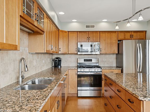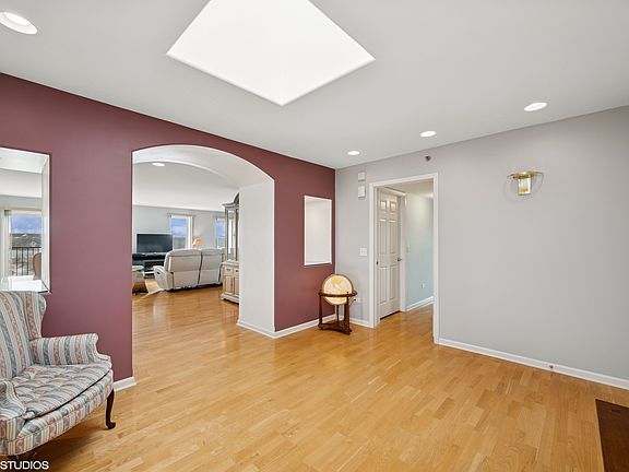 Welcome to this fabulous custom penthouse condo. Featuring 4 bedrooms 2 1/2 baths, this beautifully maintained 3060 sq ft home spans the south end of the 5th floor with stunning panoramic views from its three large balconies. As you enter the condo you are greeted by a large foyer, arched doorways and skylight. This bright and open floor plan features radiant heated hardwood floors and extensive recessed lighting throughout. Enjoy a large gourmet kitchen, custom cabinetry with soft close doors, granite counters, newer stainless steel appliances and a large pantry. A breakfast room with a wall of windows adjoins the kitchen. The kitchen opens up to the wrap around balcony which is perfect for grilling and enjoying the sunshine. This balcony will also provide you the best seat in the house to watch the Buffalo Grove fireworks. Spacious living and dining room with great views from all windows. The primary suite has two large walk-in closets and an en-suite bath with double bowl vanities, shower and soaking tub. The three additional bedrooms all have walk-in closets. The forth bedroom is so versatile and could easily become a family room or office. So many living options with such great space. Convenient two indoor parking spaces. (One space #28 is large enough for two cars) and an extra large storage area next to garage space. The home features dual zoned heat and air which were replaced in 2018. Great location, walk to the many parks and restaurants. Very financially sound HOA. Rentals are not allowed.