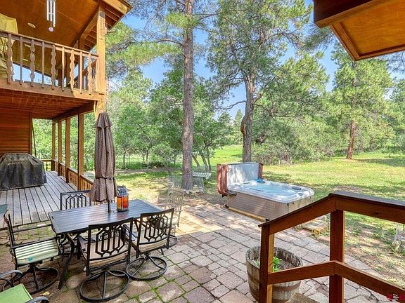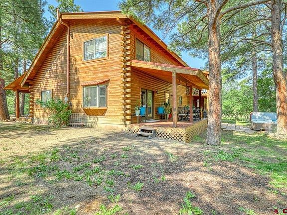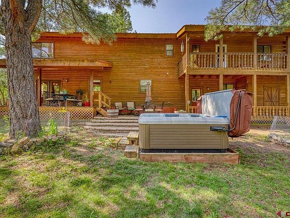 This is such a cute cabin! Centrally located in uptown Pagosa Springs yet nestled against the golf course. There are three bedrooms in the main house and a separate garage apartment. This D-log style home has that country cabin feel. Home was updated in 2020 and the current owner has added a tankless water heater (2023), new washer/dryer (2021), new refrigerator (2022) in the garage apartment. The kitchen has beautiful hickory cabinets, granite countertops, stainless steel appliances, and beautiful floors. There is a center island with a cooktop and ample space for prep surface. The living room has vaulted T & G ceilings that lend to the cozy feel of this home. The living room has a wood burning stove that brings warmth. The downstairs bedroom has been used as an office with built-in bookcases. Upstairs you will find the primary bedroom with attached bath. The bathroom has also been remodeled with a soaking tub! The walk-in closet provides ample room for all your wardrobe. There is a second bedroom on the upper level. A chair has been added to allow ease of mobility to go from the lower to the upper level in the main section of the house. There is a separate living space above the garage. The garage apartment is a one bedroom and has a great room area with a living room, dining room space, and kitchen area. A private deck is just off the back of the house for enjoying the privacy of the backyard. There are four covered decks on this home with a beautiful patio between the two lower decks. The back yard has a comfortable hammock and a hot tub. The third garage entrance is on the side of the home which is ideal for storage for your recreational vehicles. Convenience abounds as this home is located just off the golf course and a few miles from great restaurants, local grocery stores, and the medical center. A must see as this home is priced to sell.