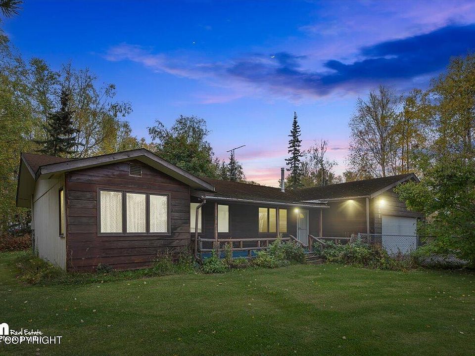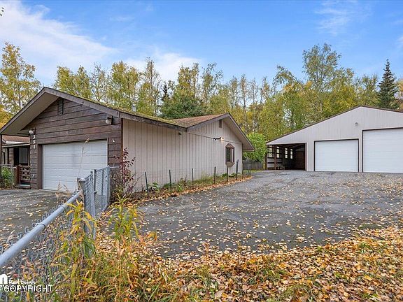 Move in ready ranch home in Wasilla with Large 1,200 sqft detached shop. Features include vaulted living room/kitchen, covered porch, landscaped yard with old growth trees and shrubs, paved driveway, and large covered area for all your summer and winter toys built right off the side of the shop.