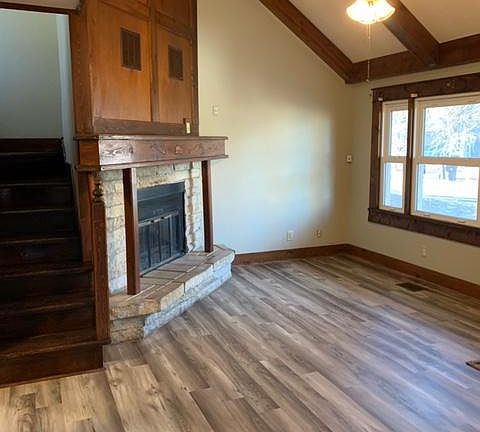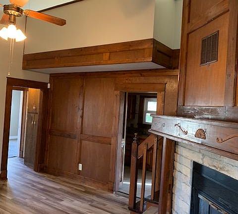 2 bedroom with loft - awesome living room fireplace and lots of nice woodwork throughout. Two bedrooms on main floor and large loft overlooking living room with sliding glass doors onto an oversized deck. Nice eat in kitchen with double doors into back yard. One bathroom and dedicated laundry room. Fenced yard and small one car garage. Very cool house - feels like it belongs in the mountains.