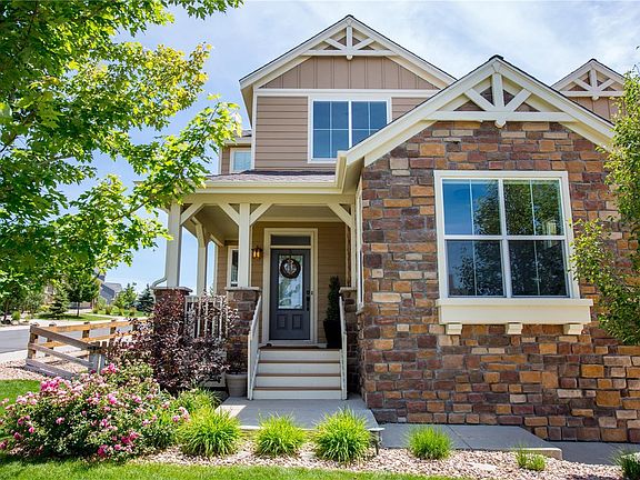 This gorgeous 4 bedroom two story home with finished basement boasts top notch design and layout. The dedicated office and gym are not to be missed and you will love all of the natural light throughout. There are parks, two swimming pools, and miles of trails within a half mile of this home. The beautifully finished kitchen with quartz counter tops and stainless steel appliances opens up to a grand vaulted living room with stone fireplace. The kitchen features a bay window that walks out to a deck with a custom pergola. The upstairs boasts three bedrooms and two bathrooms with an ideally situated laundry room. From the upstairs windows you will enjoy beautiful views of the Rockies and stunning Colorado sunsets. The newly finished basement features a guest suite complete with bedroom, walk in closet and bath, plus a generous entertainment area and gym. The home has professional landscaping and the corner lot on a quiet cul-de-sac is one of the largest in the neighborhood.