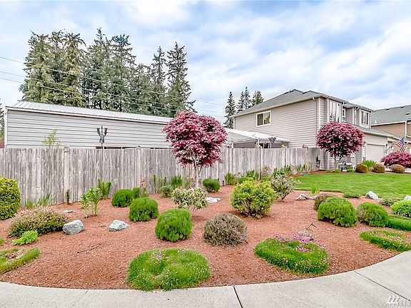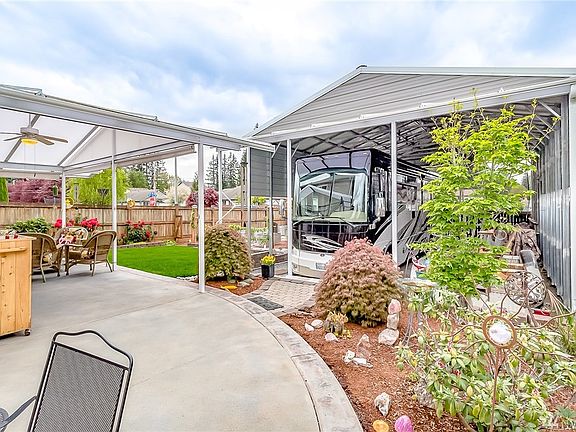 Sitting pretty on a landscaped corner lot, this beautiful 4BR home has an inviting, light-filled floorplan, hardwood flrs, granite counters, custom cabinetry, vaulted & cofferred ceilings, 3-car gar, 1200sf covered RV PARKING w/20' gate, spa gazebo w/hot tub & tv, huge wrap-around patio, fenced backyard oasis, water feature, flowers, fruit trees & raised herb gardens w/irrigation system. Great neighborhood of well-kept homes in sought-after Lakewood SD. Close to shopping ctrs, bus line & I-5.