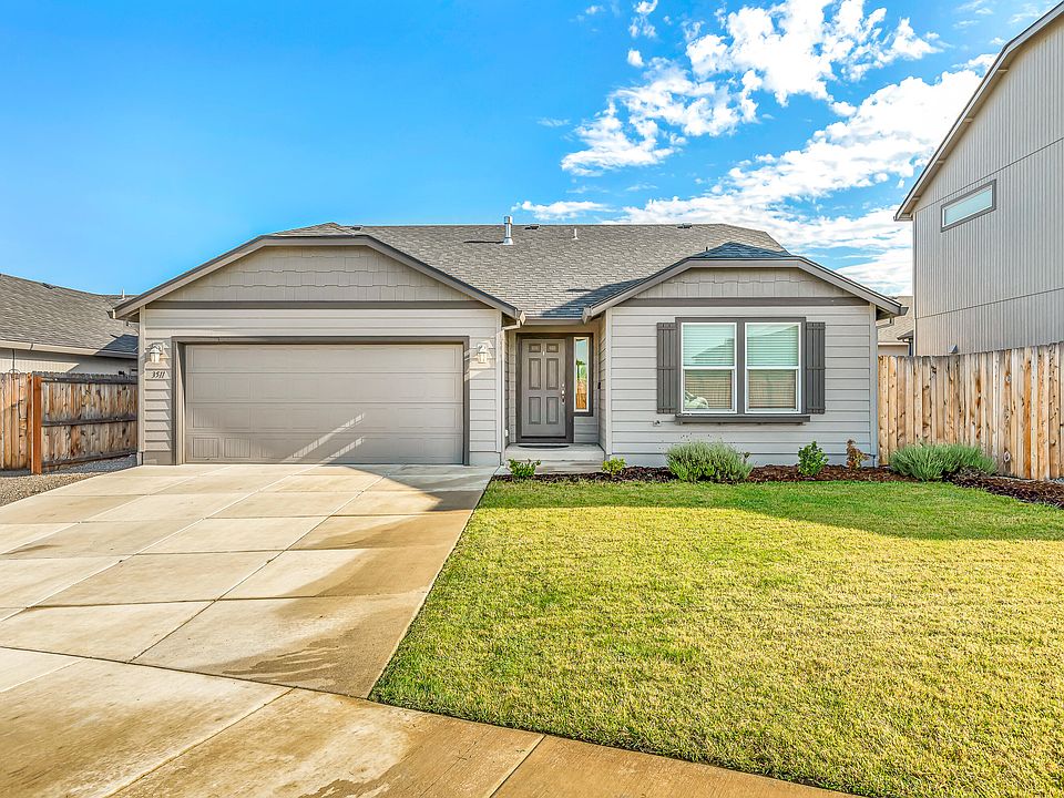 This 2019 built home sits in the Delta Estates Subdivision in East Medford. The 1408 square foot Edgewood model is an efficiently-designed single level home offering both space and comfort. This beautiful 3 Bedroom 2 bath boasts an open floorplan and upgraded trim package. Upon entering the home you have an nice wide hallway, 2 bedrooms and a full bathroom on one side and the primary bedroom and ensuite bath on the other with ceiling fan, 2 walk-in closets, dual vanity, enclosed water closet, and walk-in shower. The kitchen features a breakfast bar overlooking the vaulted ceiling living room with ceiling fan, dining area, granite countertops, large pantry, glass top range/oven, and ample cabinet space. Garage has a man door leading to the side yard and two 4' X 8' SafeRacks mounted to the ceiling for a ton of extra storage. Outside you'll find a covered patio with a natural gas outlet for BBQ together with a nice sized, fully fenced, back yard for your family gatherings.