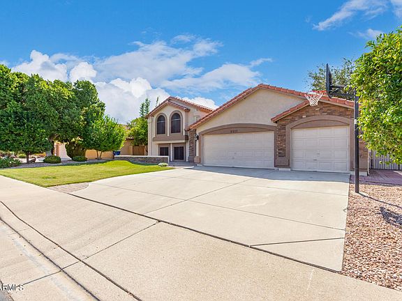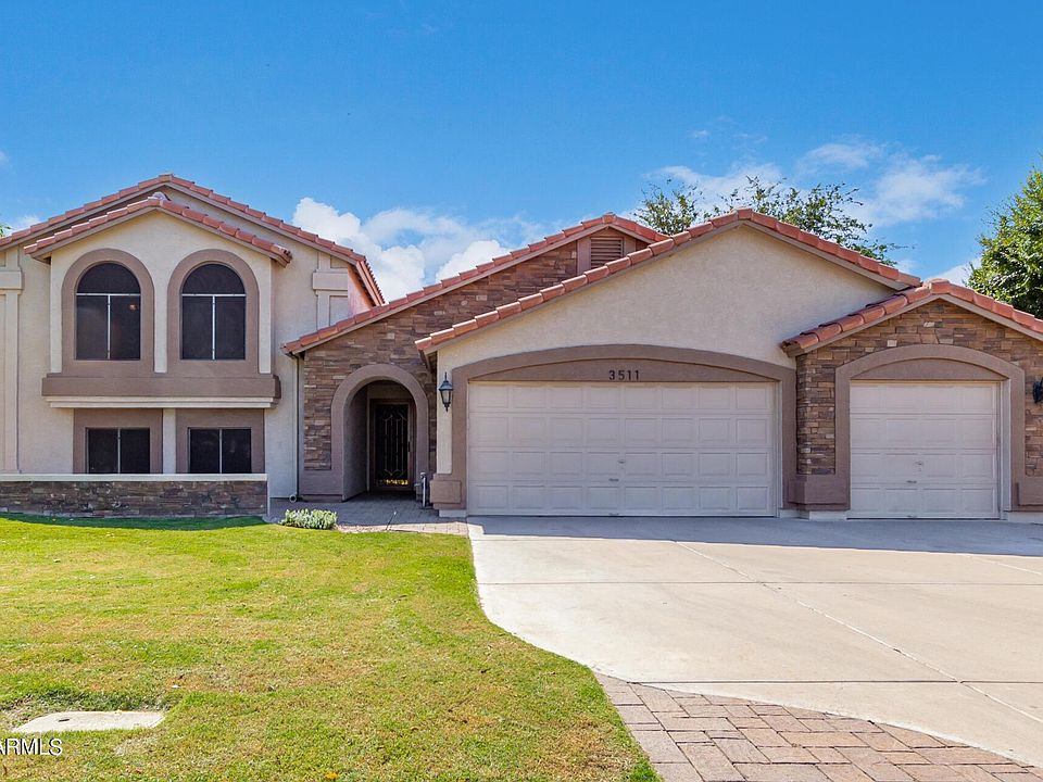 NO HOA with this wonderful 5 bed, 3 bath Home! Complete with a 3-car garage, RV gate, stone accents, AND a basketball hoop! Enter to find wood-look flooring, vaulted ceilings, bay windows, and a spacious living/dining room. Delightful kitchen boasts a skylight, ample white cabinets with crown moulding, huge pantries, matching white appliances, granite tile counters, an island, and a breakfast nook. Oversized bonus room with backyard access is excellent for a recreational area. Upstairs is the quiet Master, complete with plush carpet, a walk-in closet, and a private ensuite with dual sinks. Have fun under the sun in the wonderful backyard with a covered patio, citrus trees, Raised garden beds and a (removeable) fenced-in pool. Only three miles to the upper 202 and two miles to the 60.