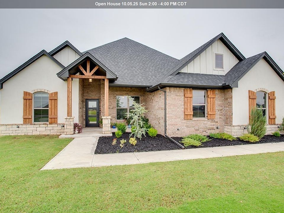 First impressions always matter and this custom built home is sure to please! That said, this home has great curb appeal with its impressive porch entry with stone and cedar post columns that flank the front door as well as fresh plantings in the flower beds. The entry into the foyer is bright, cheerful and inviting and entices you to want to see more. To the right of the foyer is a well designed home office with custom built floor to ceiling bookcases and cabinetry and a large double front window to soak in all of that wonderful natural light, and to top that off, the awesome double barn door closes the room off for needed privacy. Then on into the great room that seamlessly merge the living, dining and kitchen all together. Th living area is spacious with vaulted ceilings and gas log fireplace. The kitchen is well appointed with built in gas range cooktop and pot filler, vented range hood, dishwasher. built in wall oven and microwave. The center island is a must and provides lots of work space. The walk in pantry is a definite plus, and the large utility room is right off the kitchen and convenient to the garage as well as the mud bench room which is ever so handy. The primary suite is on one side of the home, while the other three guest bedrooms and 2 baths are on the opposite side. The primary suite has a door out to the large covered patio and back yard. The luxurious bathroom has a whirlpool tub and separate walk in shower and double sinks. The enormous walk-in closet has many shelves and hanging rods and connects to the utility room. While there are many things to love about this home, the one thing that stands out is that it has been continually maintained throughout its 2 year ownership and still looks brand new. This home sits on approx .75 acres and at this time has no homes on either side nor behind the home so you feel all of that open space around you. The seller recently added 16 solar panels to the roof of the home to cut down on the large electric bills, so please keep this in mind as a "great big perk" and another reason to purchase a very energy efficient home. Other upgrades are the Pot filler in the kitchen, remotely controlled blinds, custom bookcase, upgraded guest bath with gold fixtures and glassed in shower, and more. A considerable draw for buyers in this subdivision is its proximity to Chisholm Schools and is within approx. 1/2 mile. CLAIM your ownership now while this home is still available.