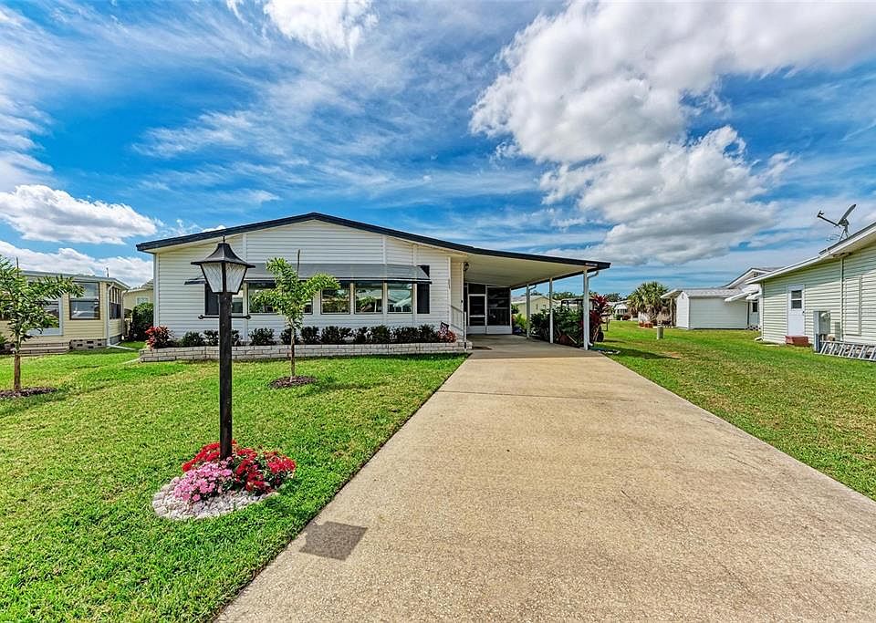 SPACIOUS LIVING, INSIDE & OUT, IS AN UNDERSTATEMENT!!! This Updated, Open Floorplan, located on a Rare 1/4 Acre Homesite, will CHECK EVERY BOX!!! High Ceilings, Abundant Natural Light, Spaciousness in EVERY Room, Fireplace, Wet Bar, Large Outdoor Living Space, Workshop/Storage & Large Carport, this home accommodates the opportunity and space for Year Around or Seasonal Florida Living at an affordable price with LOW MONTHLY FEES and NO Skyrocketing Lot Rent! New Roof in 2019; New A/C in 2021; New Waterlines in 2022; New Flooring in 2022; New Vinyl Windows in the Lanai in 2023; and New Dishwasher in 2023 and Partially Furnished!!! Clubhouse, Pools, Storage Area for Boats, Campers & RV's (based on availability & a small fee) included! Shopping, Restaurants, Outlet Mall and I-75 corridor to Tampa, St. Petersburg and nearby Bradenton/Sarasota are right on your doorstep AND you're close to Multiple Best Beaches as well! If you're seriously shopping...this is definitely a MUST SEE! Bedroom Closet Type: Walk-in Closet (Primary Bedroom).