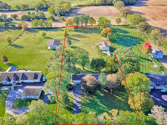 Beautiful property with gorgeous views in Prairie Grove's countryside! This all brick ranch home features 4+ bedrooms, 3 full bathrooms, a walkout basement and 2 woodburning fireplaces all on 3 acres. Bring the horses and animals and enjoy a 40 x 60 barn/ outbuilding (with 3 stalls, water and electric), 2 fenced pastures, a small paddock, 30 x 10 storage/ machine shed and plenty of room to ride. The large entryway invites you into the living room dining room combination with a huge picture window, tons of natural light and views for miles. The updated kitchen boasts newer stainless steel appliances, quartz counters, breakfast bar, luxury vinyl flooring, large closet pantry, bay window and plenty of table space. Enjoy the winter nights by the fireplace in this cozy family room with hardwood floors and inset lighting. The first floor also features 3 bedrooms including a master bedroom with walk-in closet and full master bathroom. In the lower level you with find a huge Rec room with woodburning fireplace and wet bar for all your entertaining needs. In addition, there is 4th bedroom, office/storage/ possible 5th bedroom and an updated full bathroom. There is also a workshop with an attached 4 x 9 storage/canning room. The heated 2 car garage will not disappoint with an 8 ft door, epoxy floor, workbench and even an a/c vent. Plenty of parking on this long asphalt driveway with extra side apron parking. Enjoy the views on the 28 x 20 composite deck with built in firepit. Also, tons of updates and improvements have been done including New Anderson Windows, a $30,000 drainage system, roof, updated kitchen, appliances, quartz counters, chimney tuckpointed, leaf guards, well pump and hot water heater. All of this plus a great school district and conveniently located. **See attached list of updates**
