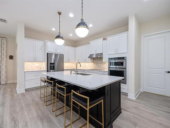 This is the one you’ve been waiting for! Welcome to this beautifully designed and meticulously maintained 3 bedroom + den, 2.5 bath single-story home, offering over 2,400 sq. ft. of air-conditioned living space and an impressive 2,650 sq. ft. of outdoor entertaining area. From the moment you arrive, the charming front porch sets the stage for the warmth and elegance inside. Step through the front door into a lovely foyer, where two spacious guest bedrooms and a full bath provide privacy for family and visitors. The open-concept dining and main living area seamlessly flow into the chef’s kitchen, the heart of the home. This well-appointed kitchen features quartz countertops, a large contrasting black center island, KitchenAid stainless steel appliances (including a 1 year old refrigerator), a wall oven and microwave, and an integrated cooktop. Custom white cabinetry is enhanced with pull-out shelves, deep drawers, designer hardware, and a stylish marble backsplash. A walk-in pantry with a custom door, a built-in bar area, and a drop zone near the garage entry add both functionality and flair. Step outside to your private travertine deck outdoor oasis, where an extra-deep covered lanai (custom-designed pre-construction) invites you to relax year-round. The heated saltwater pool and spa, accented with glass mosaic tile, overlook a serene preserve—no neighbors behind you! The spacious primary suite is a true retreat, featuring plantation shutters, custom drapery panels, and a spa-like ensuite with a dual vanity, oversized walk-in shower, private water closet, and a luxurious custom walk-in closet. A large den/office with glass French doors offers the perfect space to work from home. Guests will appreciate the conveniently located half bath, which also serves as a pool bath. The laundry room is thoughtfully designed with ample storage, counter space, and a large sink. Additional highlights include impact windows and doors for peace of mind, custom hurricane screen for the covered lanai—no need to move furniture inside during storms, 2-car garage with built-in cabinetry and epoxy floor, in-wall pest control system, designer lighting, ceiling fans, and carefully curated wallpaper, plantation shutters and custom window treatments throughout. Located in Compass Landing, a sought-after gated community in North Naples, this home offers low HOA fees (just $999/quarter) covering lawn care, irrigation water, and access to amenities like a clubhouse, pool, spa, and play area. Enjoy close proximity to Founders Square, Logan Landings, and Pebblebrooke Shoppes (Publix). Families will love being zoned for top-rated schools: Laurel Oak Elementary, Oakridge Middle, and Gulf Coast High.