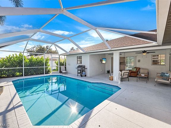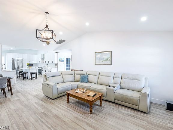 Your dream home is for sale!! Over 2400 sf. NO Hurricane damage. This beautiful & spacious 4 Bed 3 Full Baths plus Den and solar heated pool has SO much to offer! As you step through the double door entryway you are greeted by the open foyer with a den and lots of natural light. The living room is spacious with volume ceilings wood burning fireplace and custom shiplap. The kitchen features large island wood shaker cabinets and solid surface counters. Off the kitchen you have the large primary suite with wet bar sitting area and a beautiful ensuite. This home offers a split floor plan with guests on one side and the primary suite on the opposite end. Enjoy the beautiful pool views no matter where you stand within the main living areas or step out onto the screened lanai and take a dip in the heated pool! The home has many updates: Roof 2022, Solar Panels 2022, whole house remodeled in 2021, AC 2021 to name a few. Set in a very desirable and convenient location close to the many restaurants and shops that SE Cape has to offer and a 10 minute bike to shops and restaurants on 47th. This home has everything you need and more!