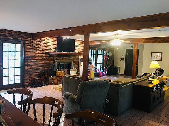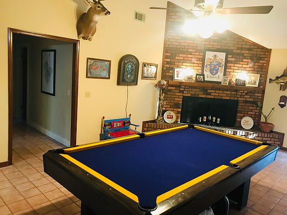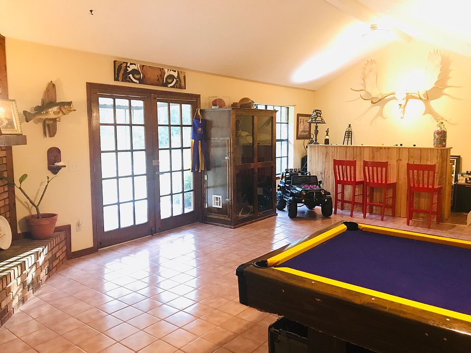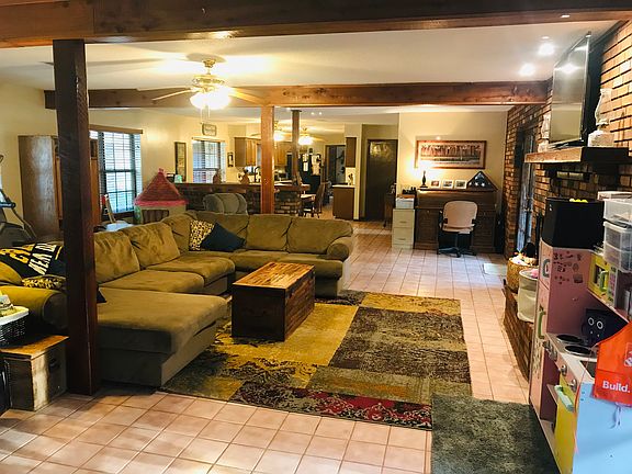 Large country home on tranquil 2.5 acres! Open floor plan, no carpet; huge living room w/ wood-beamed ceilings; bar area adjacent to kitchen, which flows into den; 2 fireplaces; master offers en suite bath. Outdoor space great for entertaining - 2 separate patios, 1 w/ screened-in partition; gravel area w/ pergola; pavilion on other side. Property also has 20x28 workshop w/ space for boat or RV, and metal-sheathed barn w/ horse stalls - both w/ power & water. Lots of outdoor space for gardens, chickens, etc
