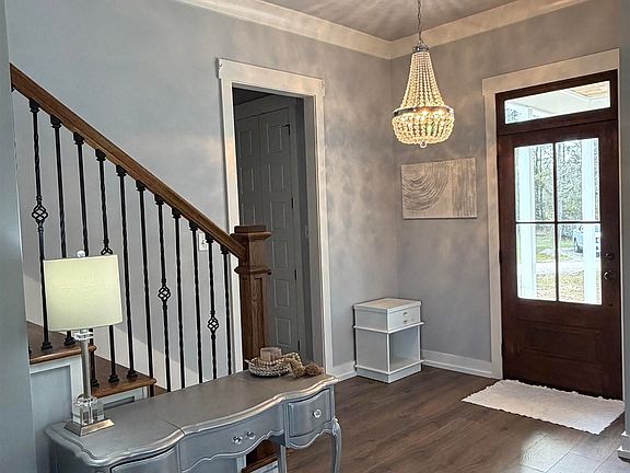 Enjoy peaceful country living in this custom-built home on 6.07 acres. Featuring 3 bedrooms and 2.5 baths, the home offers durable HardiPlank siding and a beautifully designed open-concept layout. The kitchen showcases custom countertops, stainless-steel appliances, and a large island ideal for entertaining. Elegant crystal lighting accents the space throughout. Upstairs includes two bedrooms and a versatile area perfect for a media room or additional bedroom. The primary suite features a soaking tub and spacious walk-in closet. With abundant storage and meticulous upkeep, this property perfectly blends rural charm with modern comfort.