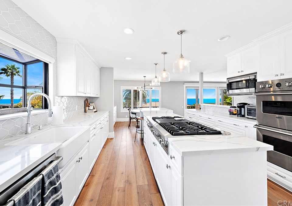 Breathtaking ocean and Catalina views from this highly upgraded modern Mediterranean 5 bedroom, 2.5 bathroom home located on coveted Camino Capistrano in Capo Beach. The upgrades includes high end hardwood flooring through out the home, added fifth bedroom located on the same level as the master bedroom, new interior doors, crown molding, recessed lighting, baseboards and renovated indoor laundry with sink. Desired open concept floor plan with the kitchen open to the family room which is open to the living room and all have amazing ocean views. The kitchen features a large island with six burner cook top with waterfall edge, farm house sink, custom cabinets, dining area, high end Viking stainless steel appliances, double oven and stone counter tops. The living room has built in cabinets on each side of the fireplace with custom surrounding stone and mantel. Ocean views from the master bedroom featuring his and hers walk in closets, upgraded en suite with dual sinks, soaking tub and walk in shower with custom finishes. Over sized roof top deck with endless ocean and Catalina views is perfect for entertaining friends and family or just laying out while enjoying the sounds of the ocean. The roof deck is a blank slate that can be furnished in multiple layouts to accommodate as needed or customize with a built in BBQ and bar seating. The garage looks like a normal two car garage from the front of the home but is actually a four car garage with room to park a RV.