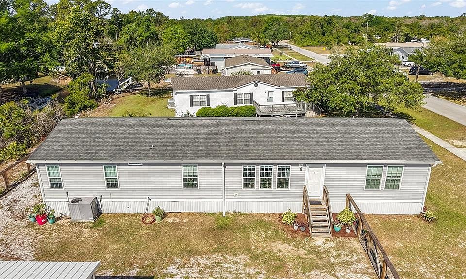 ****PRICE IMPROVEMENT****CLICK ON THE VIDEO AND TURN UP THE SOUND TO ENJOY THIS FABULOUS HOME ***Discover your waterfront sanctuary in this well appointed three-bedroom, two-bath manufactured home, perfectly situated on a charming canal leading to Lake Eustis-part of the renowned Chain of Lakes. Every room boasts refined details, including chair rail accent and knock-down ceilings that create a bright, airy atmosphere throughout. The spacious dining area is ideal for entertaining, while the modern kitchen dazzles with sleek ebony cabinets and an ingenious hidden pantry that adds a touch of surprise and practicality. The expansive master suite, a private haven, featuring an en-suite designed for relaxation in the garden tub and his and her sinks. Relax in the massive family room with your favorite drink from the wet bar with family and friends while enjoying your favorite movie. Whether your're a savoring peaceful view or exploring the local lifestyle, this home masterfully blends classic charm with modern sophistication for exceptional living. Make your appointment today to view your future home.