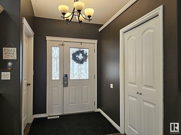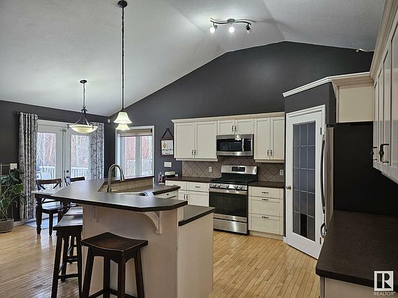 This beautiful bungalow is located in the highly sought after Regency Park neighbourhood of Drayton Valley. Located on a no thru road, traffic is minimal, and with forest behind the property, it feels like acreage living whilst in town! Upon entering the home you'll be impressed with the vaulted ceiling and open concept allowing for comfortable living within the kitchen, dining, and living room areas (hardwood flooring). The kitchen has lots of counter space, cabinetry, a pantry, stainless steel appliances, and a very functional island complete with eating bar. The master bedroom is large and features a full ensuite and walk-in closet. From the dining area one accesses an expansive deck overlooking a sizable fenced backyard with only just trees behind you. Downstairs one finds the 4th, 5th, and 6th bedrooms. The garage measures 24x24 and is fully finished with heat. Alongside the home is lots of room for your R.V.