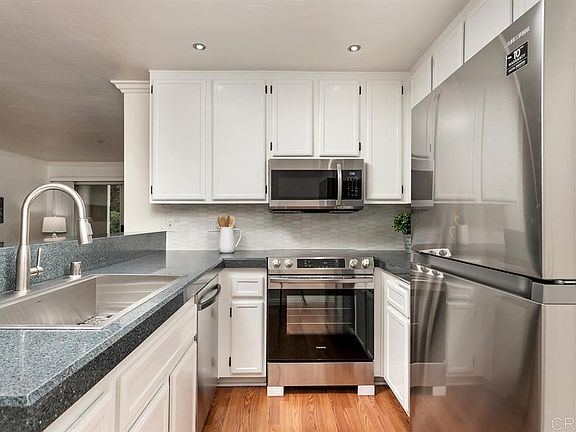 Lovely single level ground floor unit in highly sought after La Costa Hills. Two master suites, laminate flooring, stacked laundry and HUGE indoor storage room. The kitchen has been remodeled with freshly painted white cabinets, brand new appliances, new sink, new marble backsplash and a walk-in pantry. Patio access to green belt with lush view and the sounds of the nearby creek. Gated community includes pool, tennis, gym, etc. Walk to La Costa Town square, Stagecoach Park and top Carlsbad schools.