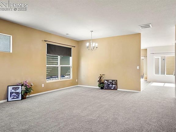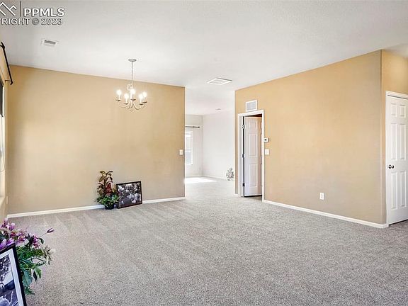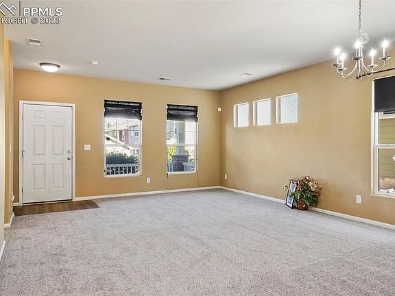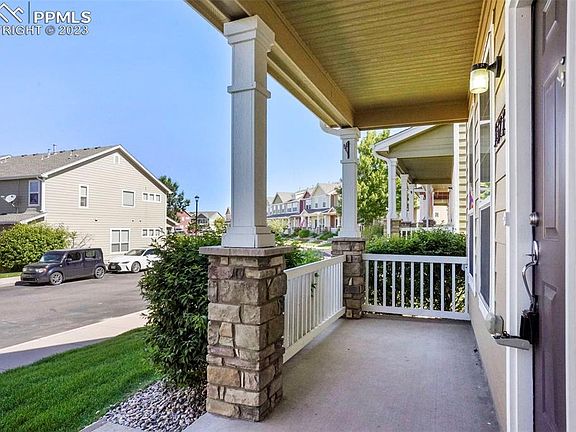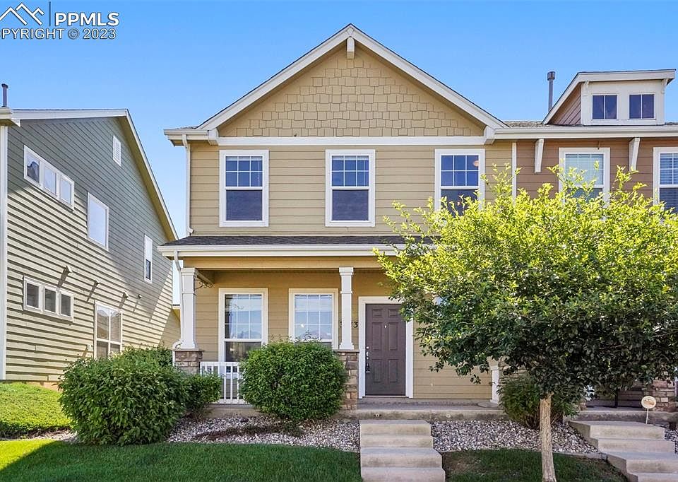 This great end unit townhome features a front porch has a view of the mountains to easily enjoy our Colorado sunsets. Once inside you find 9 foot ceilings on the main level, a large family room or break it up and us part for a formal dining, play or work area. The back of the home has a great room that features a living area with fireplace, kitchen with an island creating lots of counter space and extra cabinets storage. The 9 foot ceilings allow for 42" wall cabinets but still room for decorations and touches of home along the top of the cabinetry. The entry, eating area and kitchen have new vinyl plank flooring which is great for accessing your home, back yard and detached two car garage. The main floor is completed with a coat closet, half bath and laundry room. The primary bedroom sits upstairs in front of the home with great Pikes Peak views, 5 piece bath featuring separate vanities so you don't have to share, soaking tub, and walk in closet. Two good size bedrooms sit in the back of the home with full bath featuring double sinks in the hall. This home has air conditioning, new carpet throughout the house, side windows because it's an end unit, a community park just across the street and easy access to Academy and Powers. The Home Owners Association does a great job managing and maintaining the community. This home is move in ready.