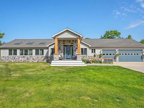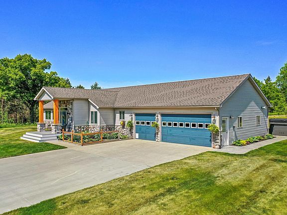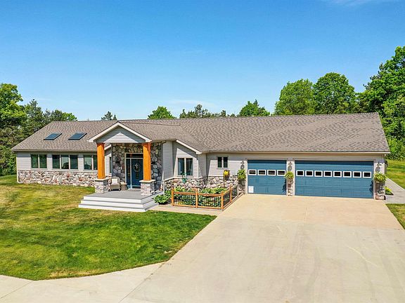 Situated atop a picturesque hill, offering an unparalleled sense of privacy & natural beauty is this contemporary ranch. This single story home boasts over 3,000 square feet of custom-built elegance, all conveniently located on one level. The open great-room floor plan creates an inviting atmosphere, complemented by generously sized rooms & an abundance of windows that showcase the breathtaking year-round views of Northern Michigan. The kitchen is a culinary enthusiast's dream, featuring yards of counter space & custom-built cabinetry. A baking island and a buffet are included, along with top-of-the-line appliances. The kitchen seamlessly flows into the large living room, which in turn opens up to an adjacent sunroom with a soaring vaulted ceiling, skylights, and a wall of windows that floods the space with natural light. The master bedroom provides ample closet space and a private ensuite bathroom complete with a luxurious soaker tub adorned as well as a separate tiled shower. Adjacent to the master bedroom is a versatile den that can easily serve as a fourth bedroom if desired. The split floor plan places two additional bedrooms and a full bathroom toward the opposite end of the home, ensuring privacy and convenience for all. A huge walk-in pantry/laundry room, along with an additional half bathroom, can be found in close proximity to the garage entrance. Speaking of the garage, the three-car space is finished, insulated and heated, offering both functionality and comfort. Outside, a sunny and low-maintenance deck awaits featuring vinyl decking as well as an electric Sunsetter awning & a hot tub. The meticulously landscaped grounds are fully irrigated, enhancing the overall appeal and ease of maintenance. For those with additional storage needs or hobbies a massive 50 x 60 insulated & heated pole building is at your disposal. This building provides all the EXTRAs = a guest bedroom and 1/2 bath off the rec room/bar, workshop, home office & 14' overhead door.