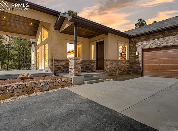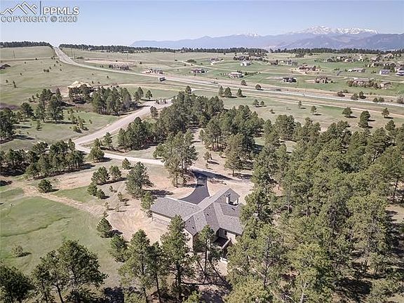 What an opportunity to buy new in popular Black Forest/Monument area! Just WOWOW on this ranch style beauty of just under 5,000 located on 2.5 acres of beautiful, mature Ponderosa and Pikes Peak view. The perfect Colorado setting with 4 bedrooms/5 baths/dedicated office. This custom home with its cathedral arches and great room concept, warm hardwood, granite counters, all Bosch appliances. 10 ft walls plus hand textured paint, beamed accents, and 8 ft. knotty alder doors and trim throughout. Award winning D38 schools! With its quick access to 83 & easy commute to Springs or Denver, simply drive down the short street to paradise. Paved roads lead to an asphalt drive as the home sits atop a knoll w/incredible views. Hardwood throughout the main areas w/ large living room w/gas fireplace w/stone & built-ins leads to a dedicated office. The kitchen has convection/oven combo, gas 5-burner cooktop, wine fridge, & refrigerator w/lots of beautiful, 42" cabinetry & double sinks for the two cooks! The master & 5-piece master bath is private & the hard to find 2nd bed on the main level has private bath. The separate dining area is perfect for parties & offers a deck prepped for future outdoor kitchen. A nice sized laundry leads to an oversized, finished, 3-car garage. Off the living room is a wonderful outdoor area overlooking the Peak, hills, & mature trees. The basement features a large family area plus full 10x15 wet bar along w/rec area. Two 2ndary bedrooms, one an ensuite w/double sinks. Lots of storage. Every room is private & other features include centralized stereo (indoor/outdoor) w/AV room, transom windows, AC on both levels, tankless hot water heater, rock retaining wall, great attention to detail, wonderful flow, & Class 4 roof. Beautiful home in a park like setting.