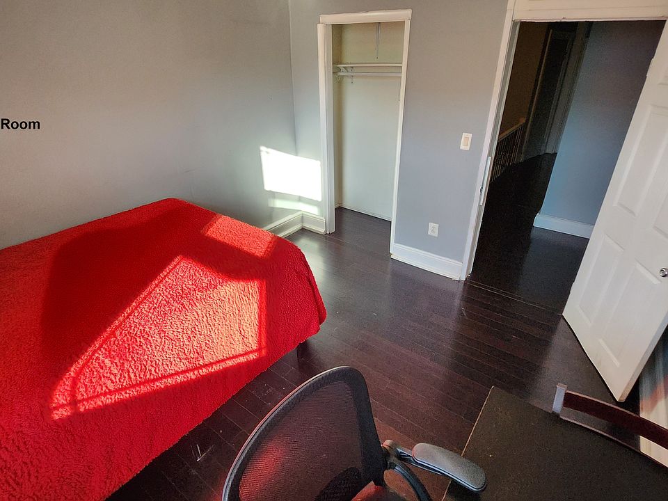 - Second level bright room with a big window, high ceilings, ceiling fan, and large closet.