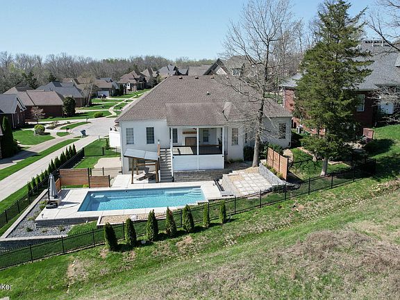 Welcome to this ''like new'' walk-out split ranch with an inground heated saltwater pool in the sought-after Fox Run community offering over 4000 Sq. Ft. of living space located in the rear of the subdivision on a .31-acre lot backing up to green space & woods for added privacy. This home has incredible curb appeal with a circular driveway for guest parking and beautiful landscaping. Enter the custom front door with sidelights into the open living concept featuring a great room w/gas fireplace, a dining room, a breakfast room w/vaulted ceiling and a stunning kitchen. The kitchen boasts French Provincial style cabinetry, a gas cooktop, a pantry, stainless appliances, a breakfast bar and what appears to be quartz or quartzite countertops with waterfall element. The primary suite is privately located on the left side of the 1st floor with tray ceiling and offers a deluxe spa-style bathroom with a jetted tub, art glass window, custom tiled walk-in shower, double vanity w/granite counters and a spacious walk-in closet. On the other side of the home, you will find 2 bedrooms (1 used as home office w/built-ins) and a jack & jill bath w/double vanity. There is also a half bath and laundry room on this level. A large covered rear deck is accessible from the great room and looks over the incredible new (2023) fiberglass heated inground saltwater pool enclosed with black aluminum fencing for all your summer entertainment needs. There is also a 220 outlet under the deck for possible hot tub addition. In the walk-out lower level you will find a huge family room (w/private side patio), 2 additional bedrooms (one used as media room) and a full bath. Architectural details include hand-scraped hardwood flooring, arches, columns, crown molding, vaulted and tray ceilings. There are 12 generous closets (some walk-ins) and a large 259 Sq. Ft. utility/storage room. The annual HOA fee is $325 and covers maintenance of public areas and snow plowing. LG&E averages around $200 per mo. & water/sewer averages approximately $110 per mo. per previous owner. This is a must-see custom built, wonderfully updated and maintained home that is sure to please.