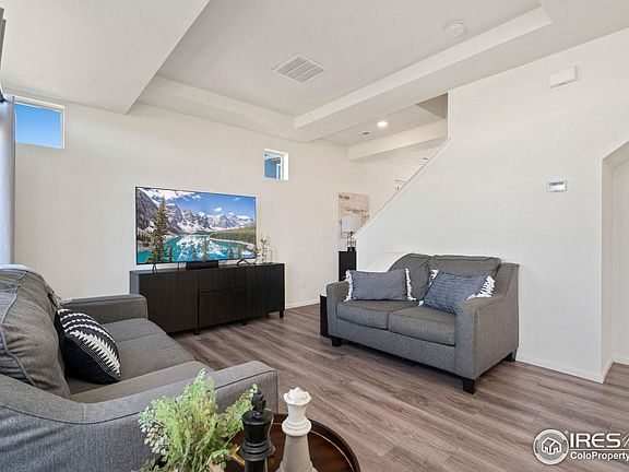 Introducing 3514 Valleywood Ct., an inviting 3 bed, 3 bath low-maintenance home nestled in the coveted Thompson River Ranch community in Johnstown, just minutes from Loveland. Step into an airy open-concept layout graced with expansive windows along the rear wall. A substantial kitchen island is adorned with granite countertops, offering space to dine and converse amidst mountain views. Venture upstairs to uncover a spacious primary bedroom complete with an en suite bathroom featuring granite counters, a double vanity, and a spacious walk-in shower accented by a modern glass door alongside a generously sized walk-in closet. Distinguishing itself from similar models, this home boasts two additional bedrooms on the upper level, providing ample space for guests or a home office. Enjoy the convenience of laundry on the upper level and a second full bathroom filled with abundant light. Journey to the third level to discover a captivating rooftop patio, offering a one-of-a-kind space to entertain friends and bask in the fresh air. Unwind on an additional patio in the fully-fenced backyard and address all your storage needs with the two car attached garage. Enjoy laid-back living enriched by the various amenities that Thompson River Ranch offers - two swimming pools, three diverse playgrounds, a disc golf course, a multitude of walking and biking trails, a newer PK-8 school within the neighborhood, and a brand new community center offering a fitness area and a gathering space where residents can socialize. This home is situated in a prime location with immediate access to I-25 and the wide array of shopping and entertainment offered at Centerra. Embark on the virtual tour and explore this noteworthy home in a sought-after community.